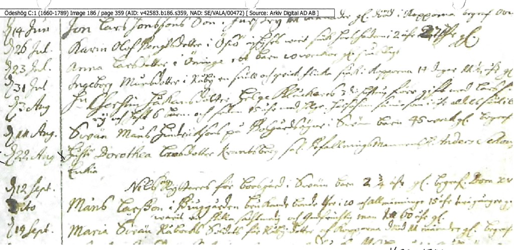 The Ödeshög Parish Clerk did genealogists a great favor by including Anders Skoug’s age at the time of his death in 1696 as 72 years of age. When Anders was appointed parish befallningsman he would have been 36 years old. He and his wife, Dorothea Crantzberg, established their residence in Ödeshög Parish about that time. There are no records of his marriage or the birth of his children however I found records of five of them. Unfortunately, estate documents were not required until 1723 and that would have given us a more complete picture of his living descendants.