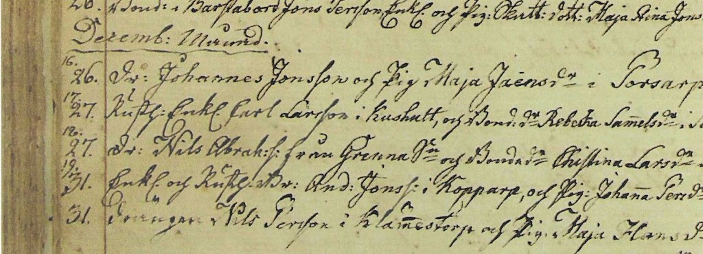 Carl Samuel’s mother remarried in 1787 to a capable young tenant farmer, Johan Nilsson, who took over management of the farm and became a surrogate father to the three young fatherless boys. Unfortunately, the young farmer, Johan Nilsson, died in 1797 at age 35 leaving Maria a widow once again. Carl Samuel, however, was 15 years of age and was able to take over the management and responsibility of the Kushult farm and Rusthåll. His dedication to duty and family remained with him until his death at age 76. (Not to worry about Maria – she remarried once again, returned to her home farm, Frebol, and died at 93 years of age.)